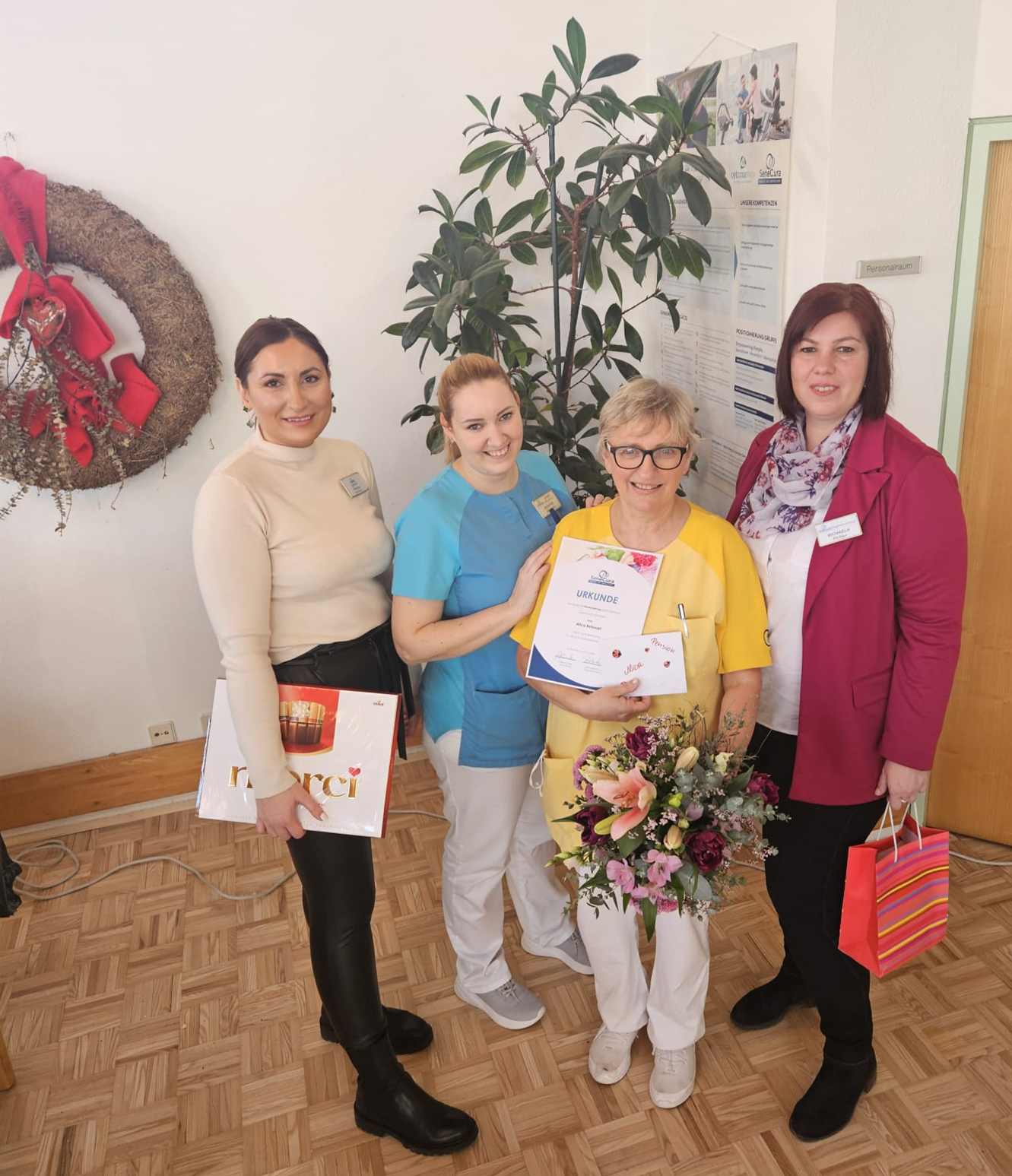 Frau Alica Belovari kam 2019 ins SeneCura Pflegezentrum St Veit an der Glan und absolvierte neben der Arbeit ihre Ausbildung zur Heimhilfe. In den letzten 5 Jahren konnten sich Bewohner:innen wie Kolleginen und Kollegen stets auf ein Lächeln und ihre zuvorkommende, liebevolle Art freuen. Nun mussten wir sie schweren Herzens in ihren wohlverdienten Ruhestand gehen lassen. Gefeiert wurde zwar zwei Tage lang, trotzdem fällt der Abschied schwer. Das Team des SeneCura Pflegezentrums St. Veit an der Glan wird sie in deren Alltag sehr vermissen, freut sich jedoch sie weiterhin bei Festen und Aktivitäten dabei zu haben. Wie Alica kürzlich zur Hausleitung Mariana Grgic sagte: „SeneCura geht unter die Haut. Man ist für immer ein Teil davon, deshalb werdet ihr mich auch in meiner Pension oft im Haus sehen“.