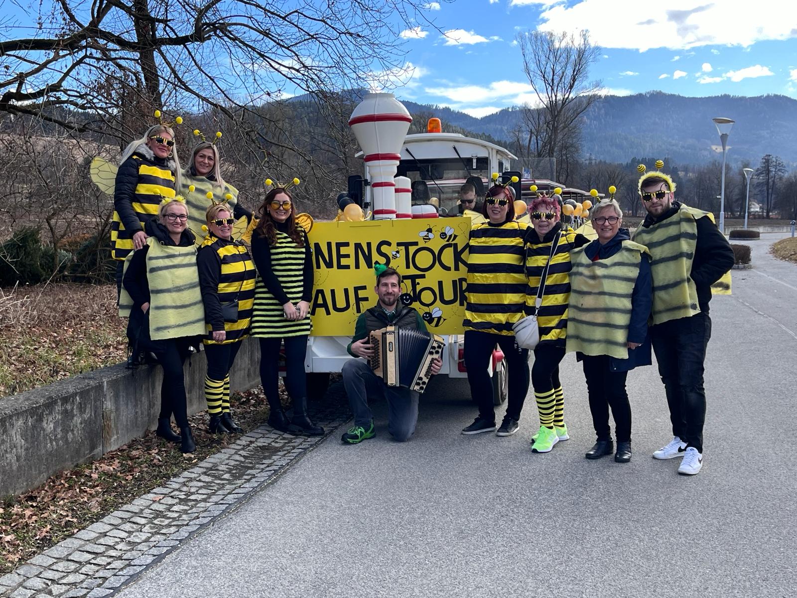 Gestern hatte das SeneCura Pflegezentrum St. Veit an der Glan erneut die Ehre beim traditionellen St. Veiter Faschingsumzug dabei sein zu können. Über 40 Gruppen wurden von der Faschingsgilde Namla Woll Woll eingeladen und die Bewohner:innen freuten sich sehr, teilnehmen zu dürfen. Als Thema überlegte sich das Haus heuer etwas, was allen – Bewohner:innen wie Mitarbeiter:innen – ein Begriff ist und so entschied sich das Team und die Bewohner:innen für „Biene Maja/Sum Sum – Ein Bienenstock auf Tour“. Der Zeichentrickfilm, bei dem wir generationenübergreifend sagen können, dass er zu unserer Kindheit gehört. So ging es am Faschingsdienstag für etwa 30 Bewohner:innen und Mitarbeiter:innen mit dem Bummelzug in die Stadt und alle genossen die geimeinsame bunte Zeit.
