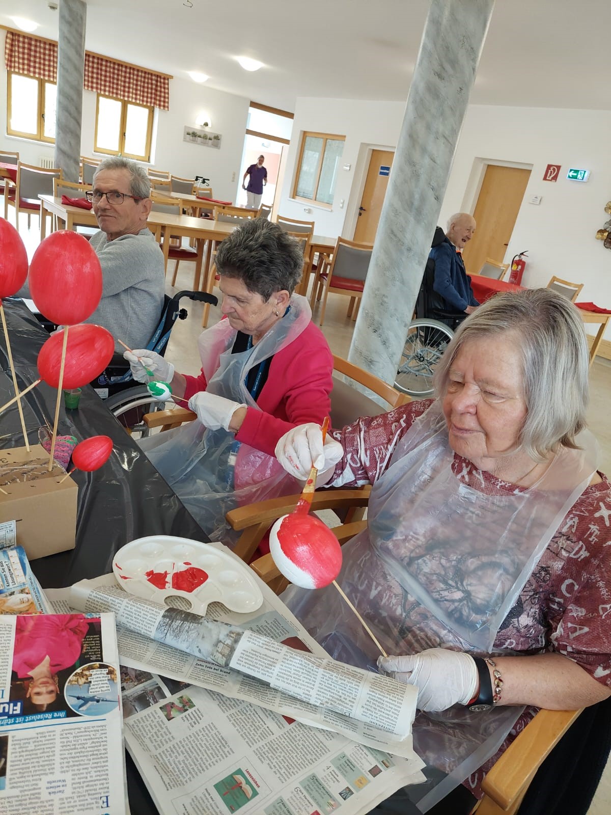 Mit voller Konzentration bemalen die Bewohner:innen bunte Eier für den Osterkranz.