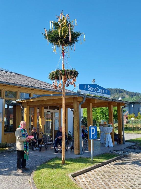 Wie jedes Jahr, stand auch heuer wieder das traditionelle Maibaum-Aufstellen im SeneCura Pflegezentrum St.Veit/Glan am Programm. Am 30. April 2024 wurde der von den Mitarbeiter:innen organisierte und gemeinsam mit den Bewohner:innen festlich geschmückte Maibaum bei strahlendem Sonnenschein aufgestellt. Der Baum wurde von Pfarrer Johann Fercher festlich gesegnet und schmückt jetzt den Eingangsbereich unseres Pflegezentrums.