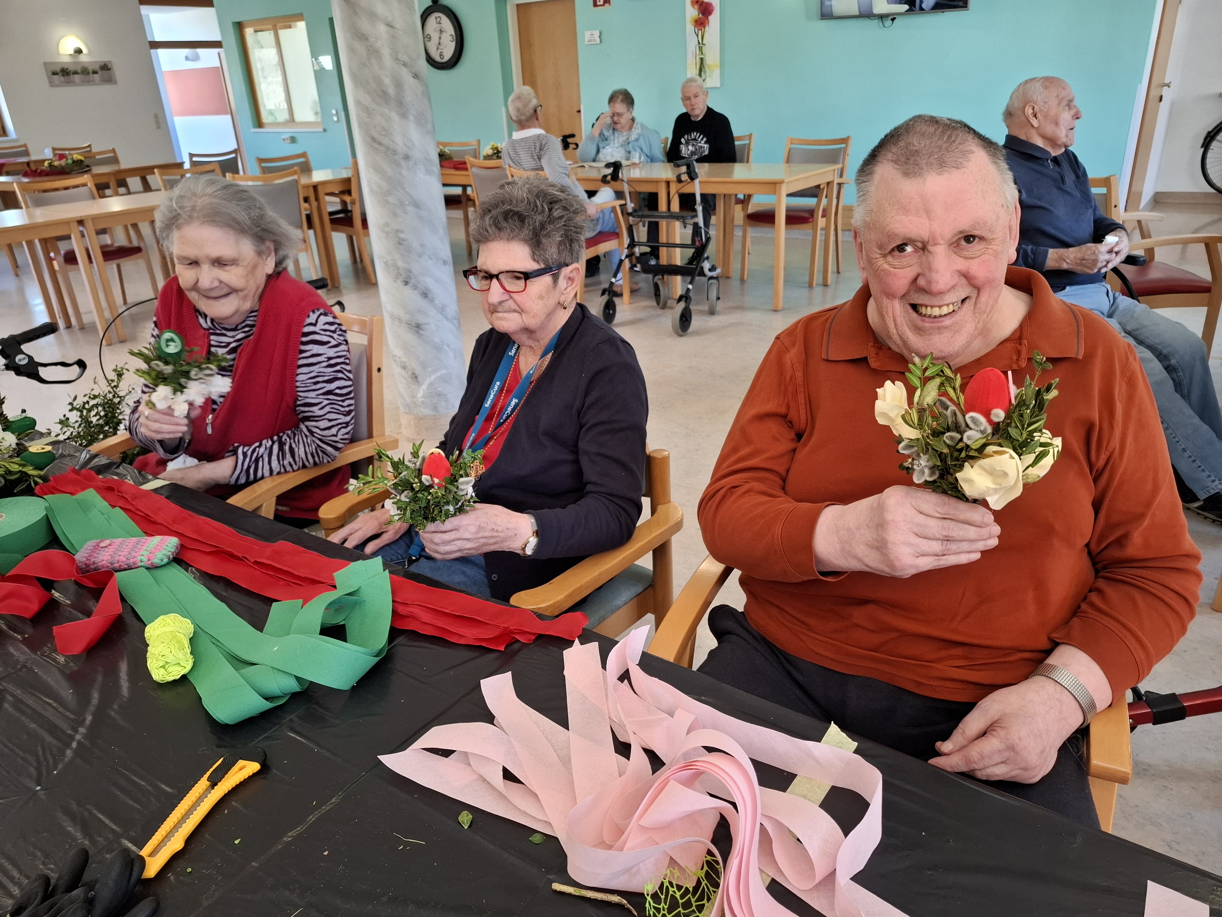 Ostern ist nicht mehr weit: Deshalb starteten die Senior:innen des SeneCura Pflegezentrums St. Veit an der Glan bereits eifrig mit den Vorbereitungen für das in Kürze stattfindende Fest. Begonnen wurde mit dem Binden der Palmbuschen. Dazu schnitten die Senior:innen die saftig grünen Zweige zu, arrangierten sie gleichmäßig und banden sie anschließend mit einer Kordel zusammen. Tatkräftige Unterstützung bekamen sie dabei unter anderem von der Seniorenbetreuung des Hauses. Die Weihe der selbst gemachten Palmbuschen findet traditionell am Palmsonntag in der Hauskapelle statt. „Das Osterfest hier im Haus gefällt mir immer sehr gut. Vor allem das Basteln macht mir viel Spaß und ich bin stolz auf unsere schönen Palmbuschen, die wir gemeinsam hergestellt haben“, freut sich eine Bewohnerin des SeneCura Sozialzentrums St. Veit an der Glan.